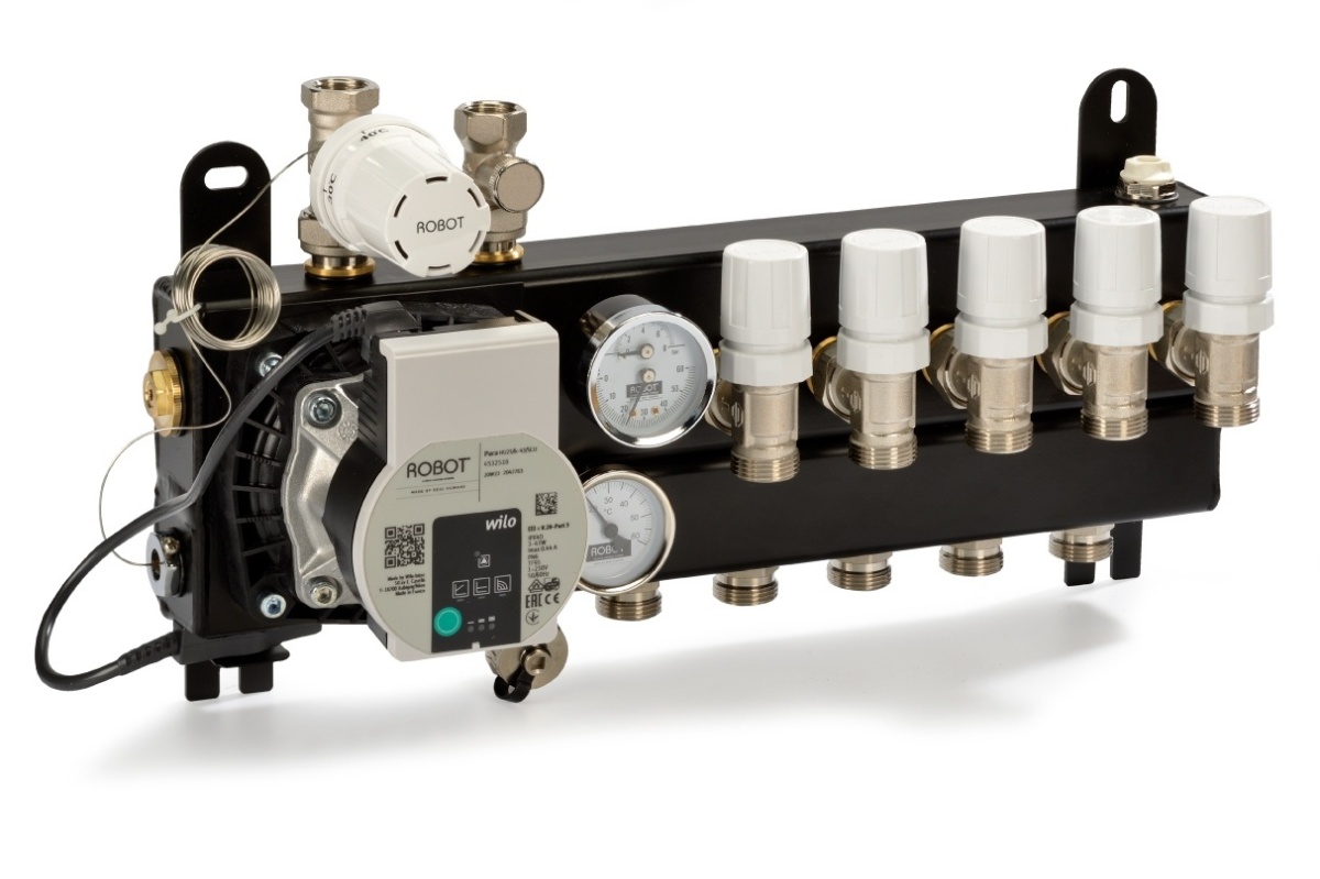 De Standaard PRO verdeelunit van Robot Vloerverwarming is een alleskunner. Hij is geschikt voor aansluiting op zowel hoog- en laagtemperatuur verwarmingsbron. Robuust en compact.